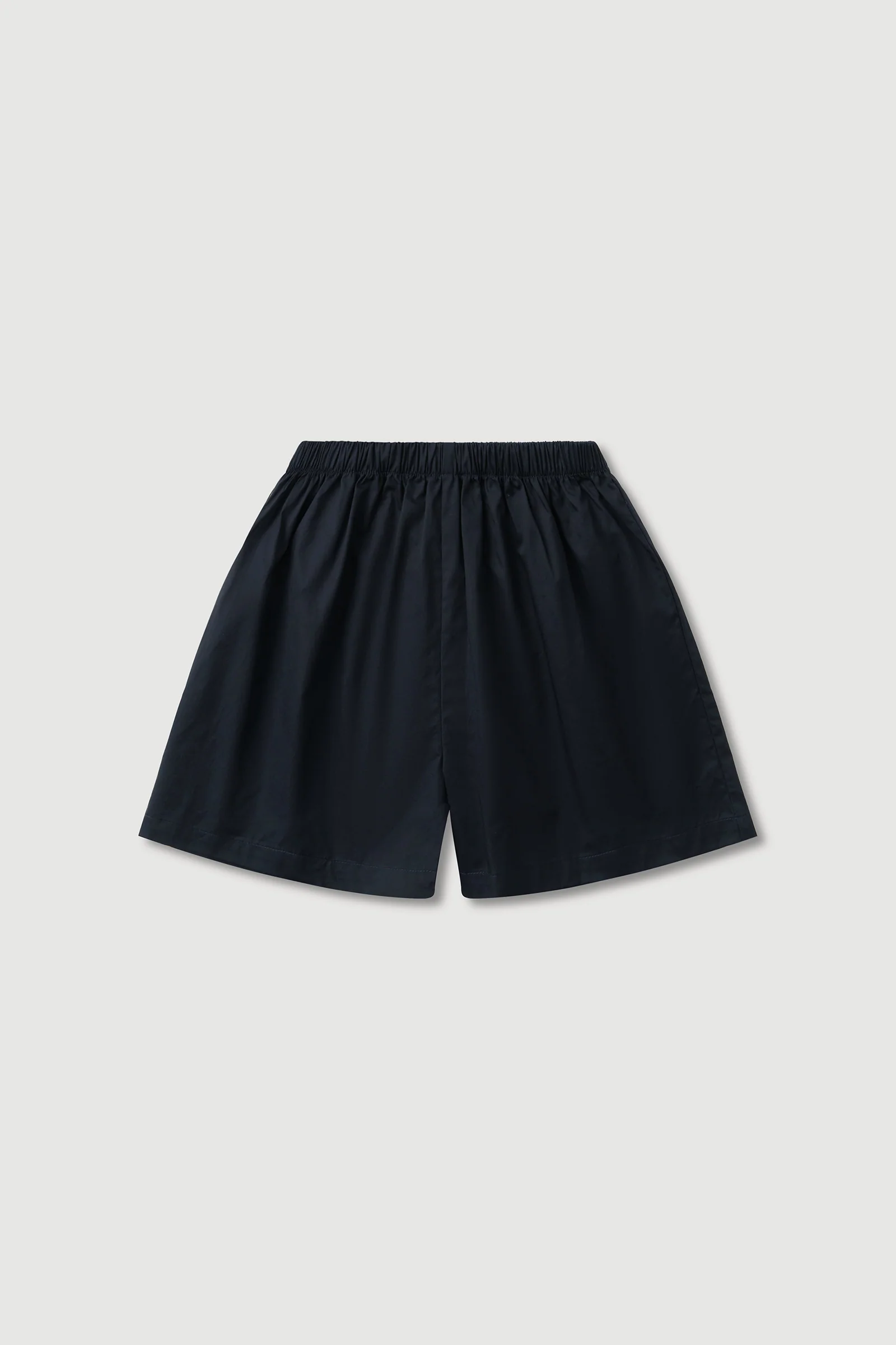 Kids unisex knee-length cotton poplin short featuring an elasticated waistband for a comfortable, relaxed fit.