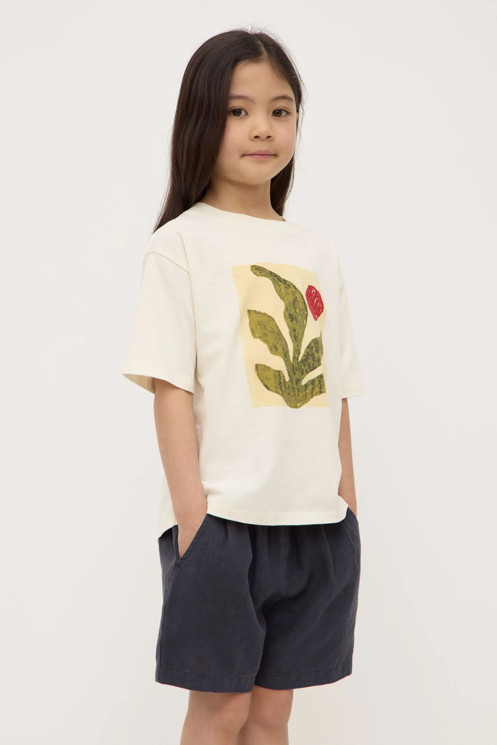 Kids unisex relaxed fit tee featuring ribbed neckline and centre-front print.