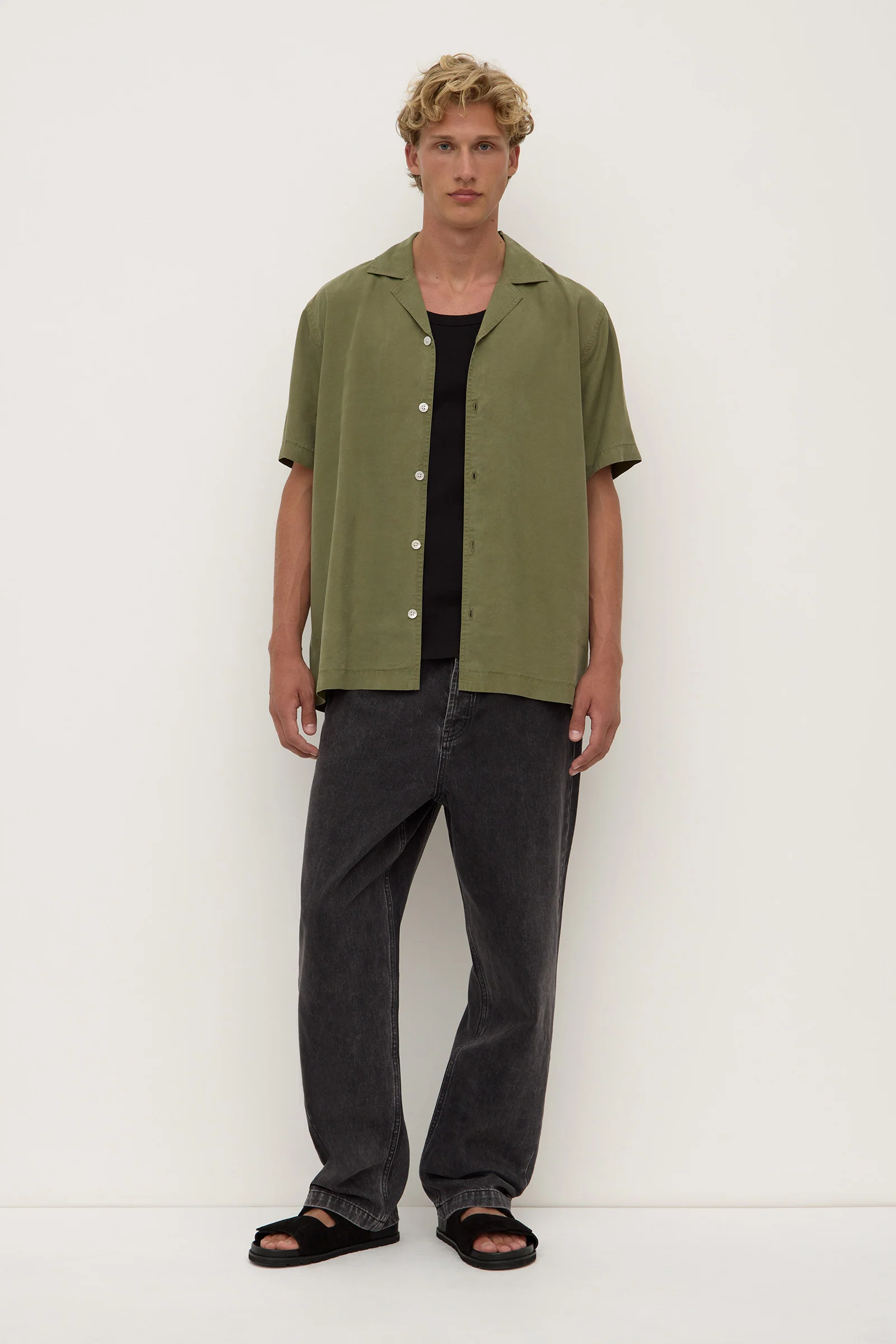The Miller Short Sleeve Shirt in chive is a relaxed button-up made from a premium lyocell-linen blend with a smooth, soft feel and breathable finish.