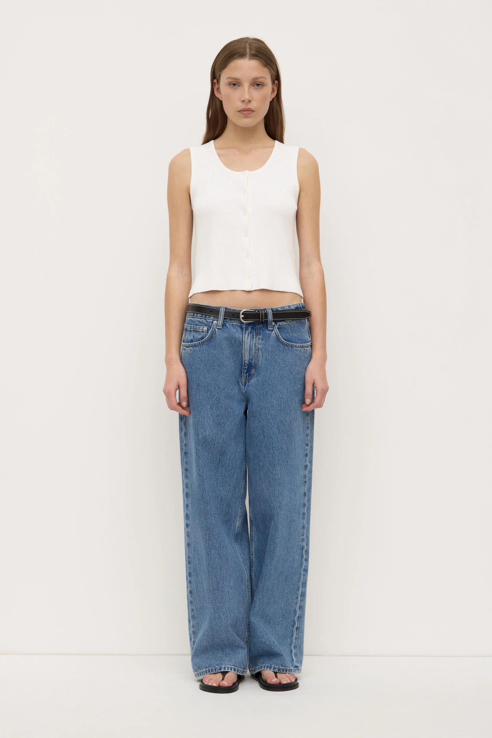 Designed for a slim fit, this sleeveless top is cut in a vest-style silhouette, featuring a button front and ribbed detailing.