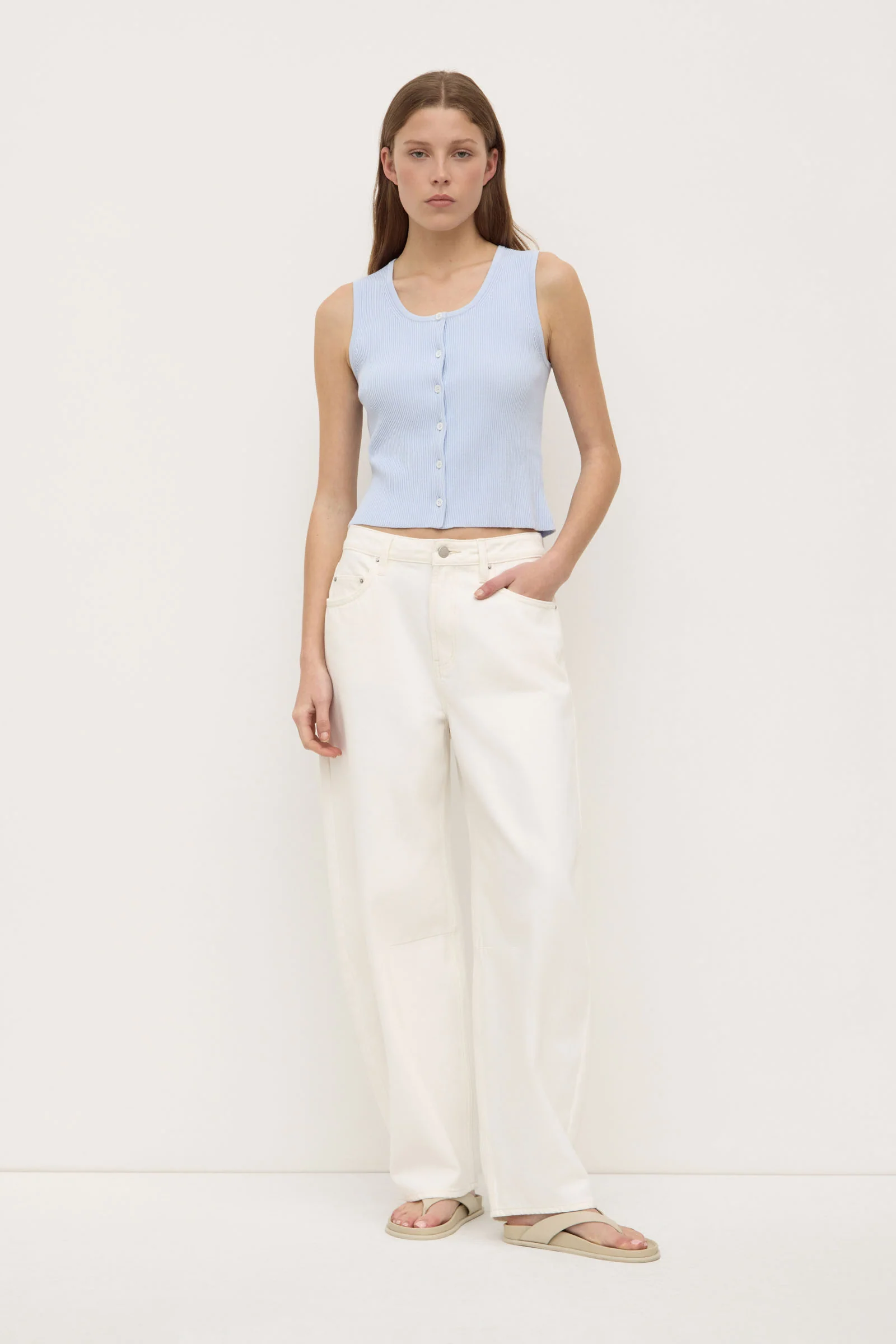 Designed for a slim fit, this sleeveless top is cut in a vest-style silhouette, featuring a button front and ribbed detailing.